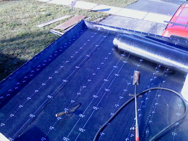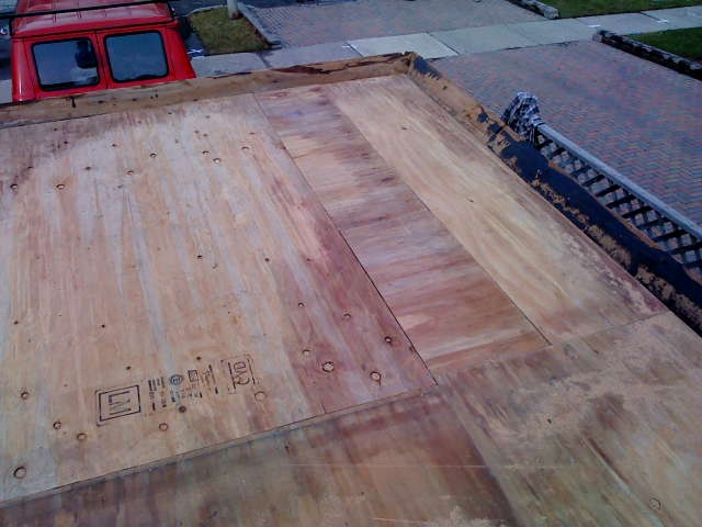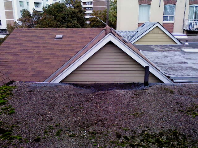 buckled, moss growing flat roof